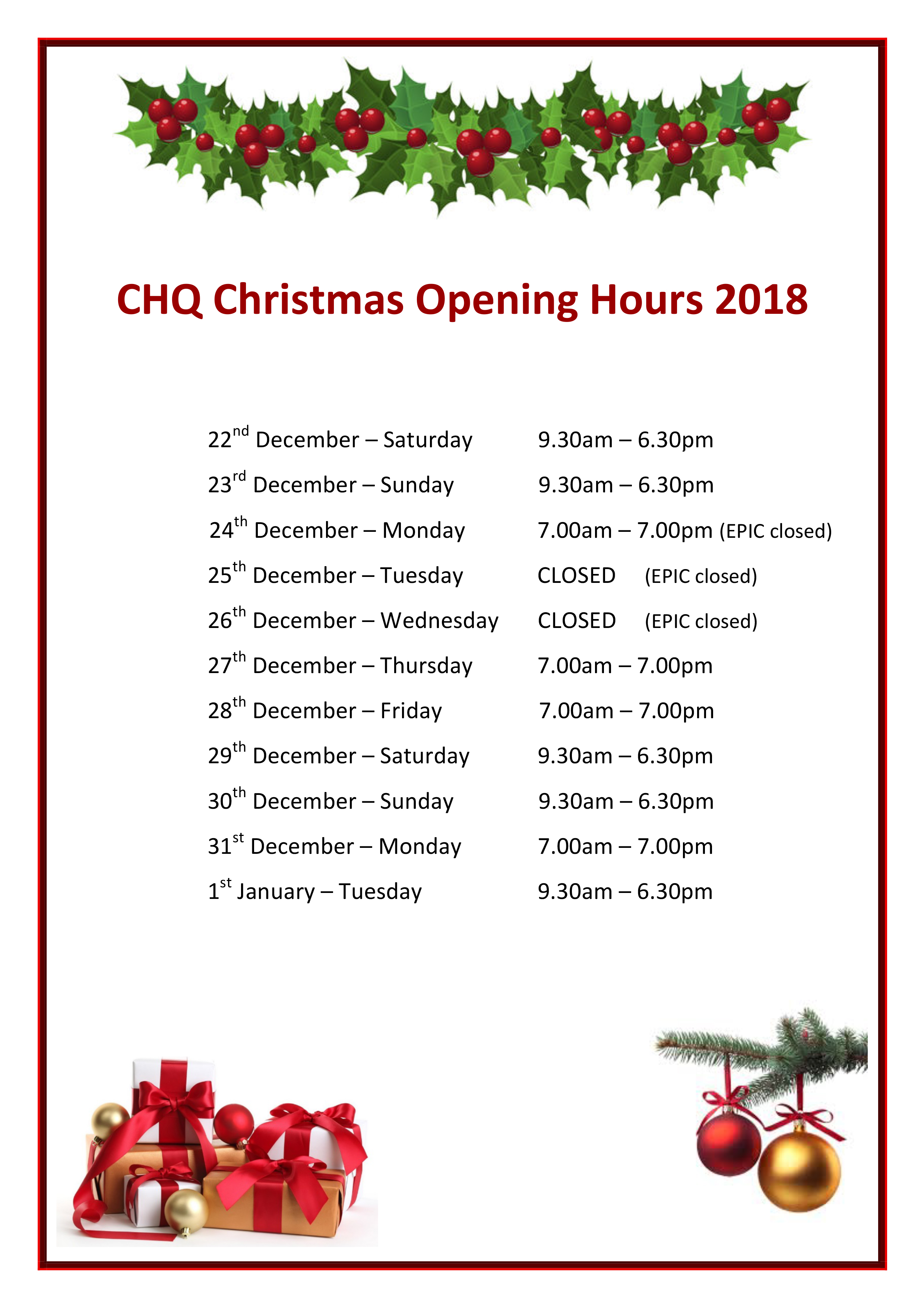 Closed December 25th & 26th